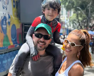 Em vídeos publicados nas redes sociais, a família aparece se divertindo na avenida, em meio à espuma e à multidão de foliões.